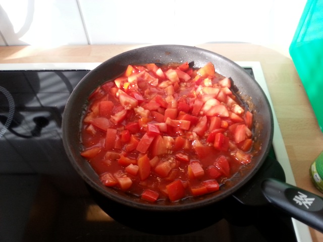 Spaghetti Pesto: Tometen zu der Soße hinzufügen