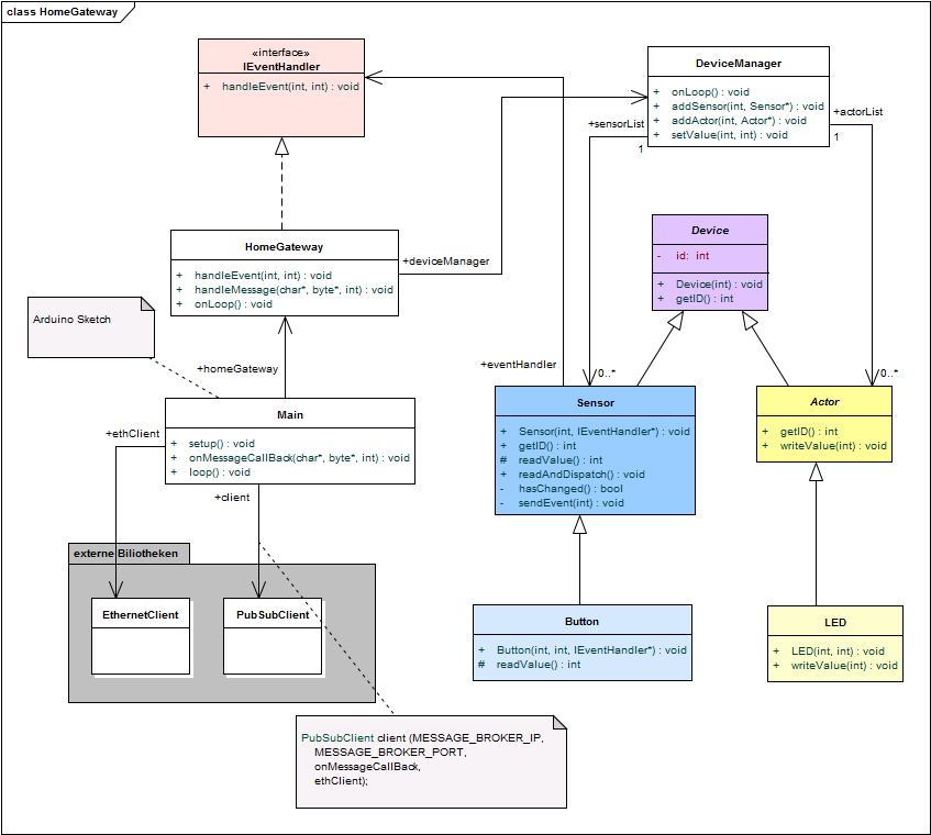 Arduino-Klasse mit den Methoden setup() und loop(). In der main-Klasse wird die Klasse HomeGateway instanziiert. Auch befindet sich in der Klasse die Methode onMessageCallBack, welche von der MQTT-Bibliothek aufgerufen wird, wenn Nachrichten für angemeldete Kanäle vorliegen.