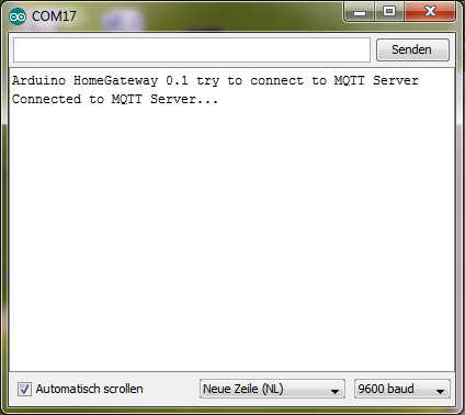 Als erster Schritt muss das Netzwerk aufgebaut und anschließen der MessageBroker gestartet werden. Wenn jetzt das Programm auf dem Arduino installiert wird, sieht der erfolgreiche Verbindungaufbau in der seriellen Konsole folgendermaßen aus: