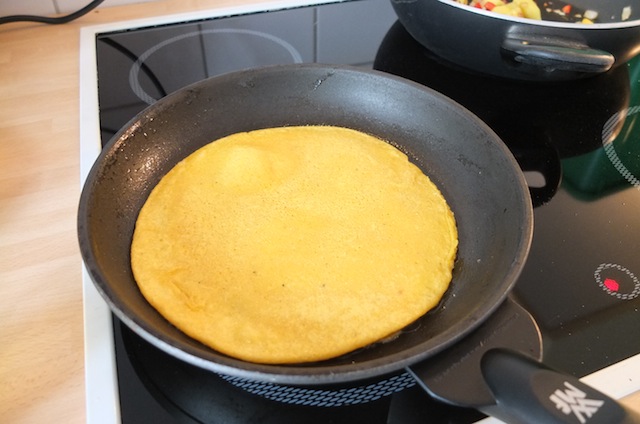 In der Zwischenzeit die Omelett-Masse anrühren. Dazu das Kichererbsenmehl mit dem Sojadrink verrühren. Kurkuma und etwas Salz hinzufügen. Die Masse in eine leichtgefetteten Pfanne geben und kurz backen/braten.